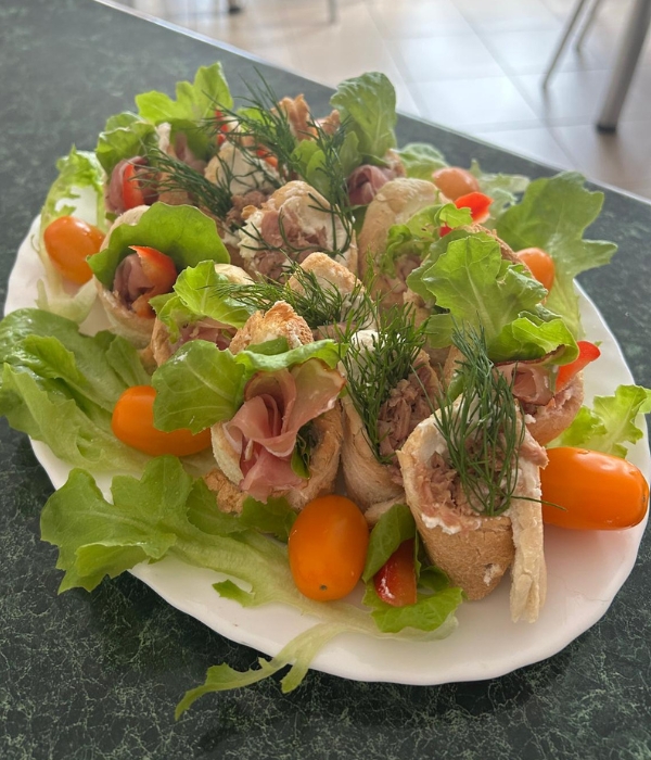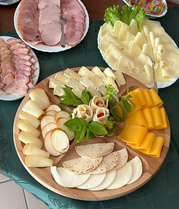 Podajemy około 6 rodzajów serów, 6 rodzajów wędlin, sami robimy smalec, boczek pieczony, szynkę gotowaną i pasztet . Codziennie własnoręcznie robimy różnego rodzaju sałatki i pasty. Dla amatorów ryb przygotowujemy pyszne śledzie.